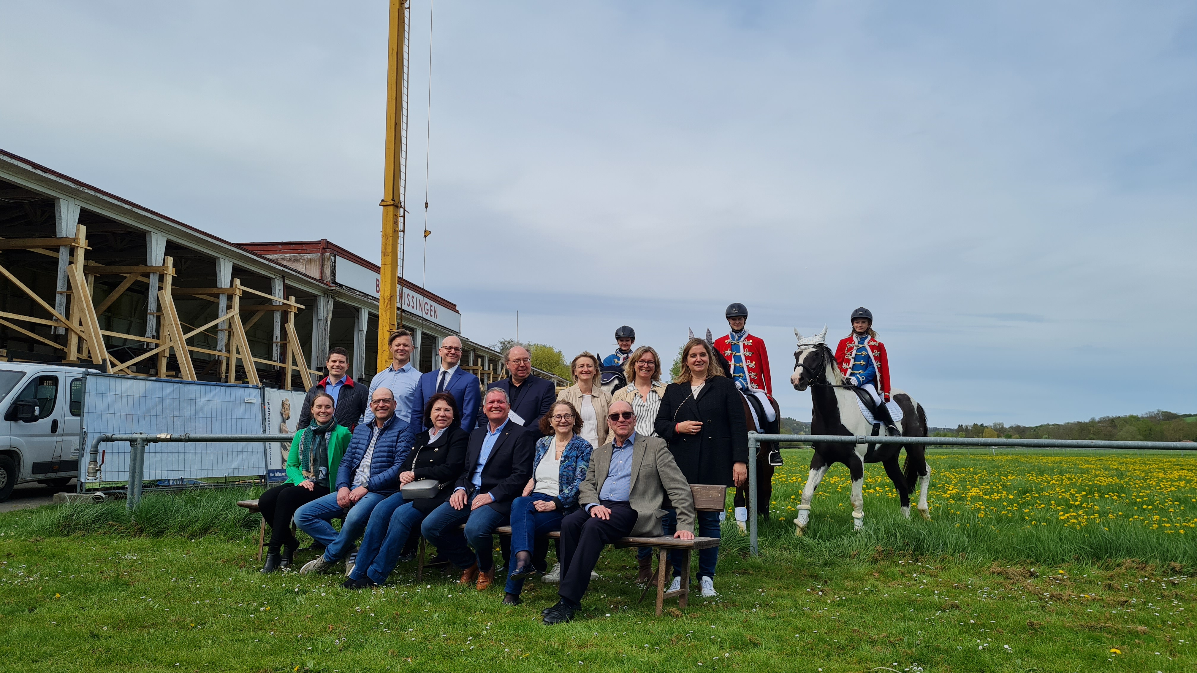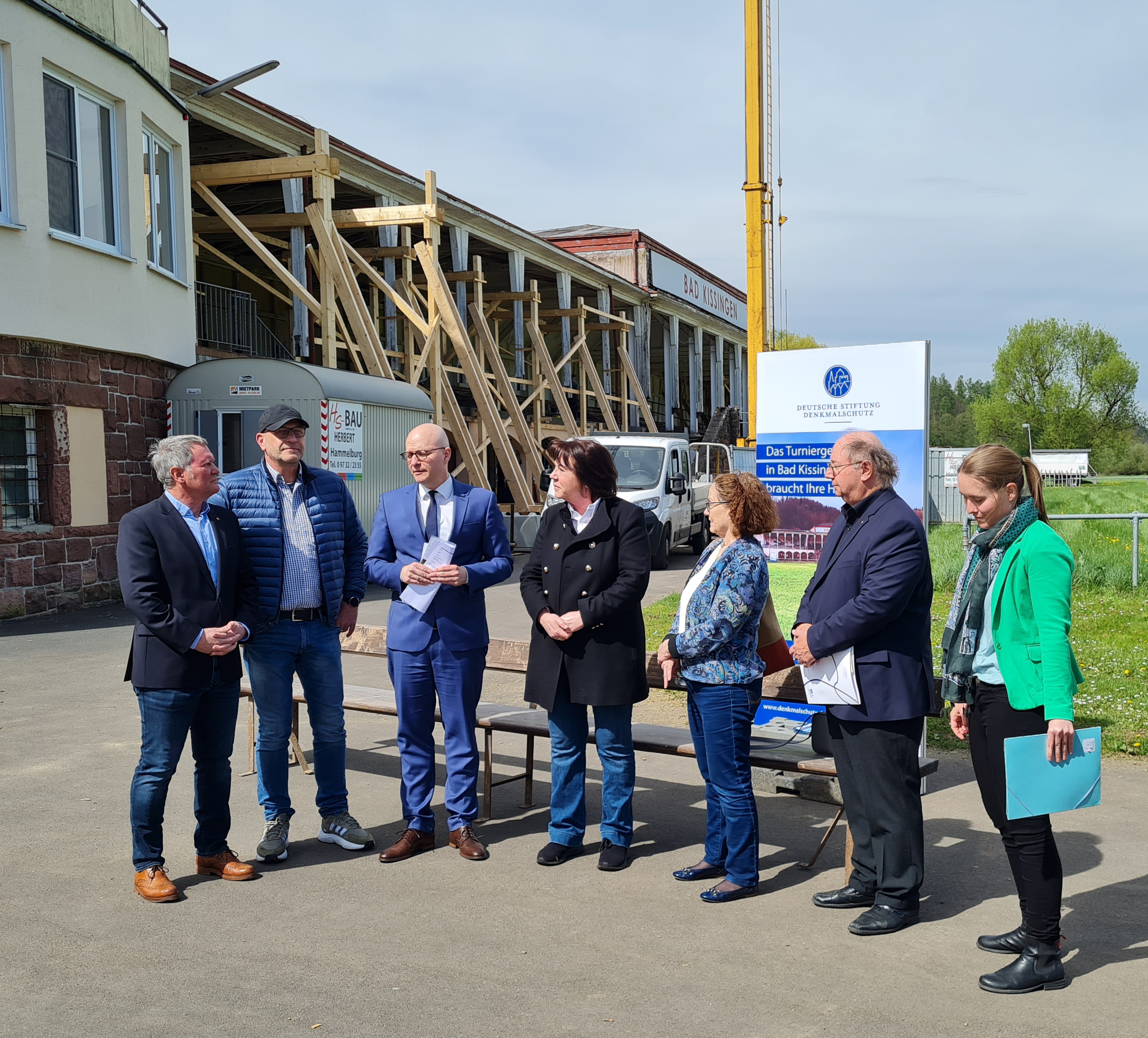 Im Beisein von Oberbürgermeister Dr. Dirk Vogel und Dr. Ursula Schirmer von der Deutschen Stiftung Denkmalschutz wurde heute vor Ort das Sponsoringpaket für das bereits in der Sanierung befindliche Turniergebäude Bad Kissingens vorgestellt. Mit dabei waren auch Matthias Albert als Vertreter der direkt benachbarten Segelfluggemeinschaft Bad Kissingen sowie von unserer Vorstandschaft unser 1.Vorstand Horst Waldner, stellvertr. Vorsitzende Sabine Sell, Schatzmeisterin Simone Schmitt, Reitwartin Claudia Lutz und drei unserer Reiter in Uniform hoch zu Pferde.